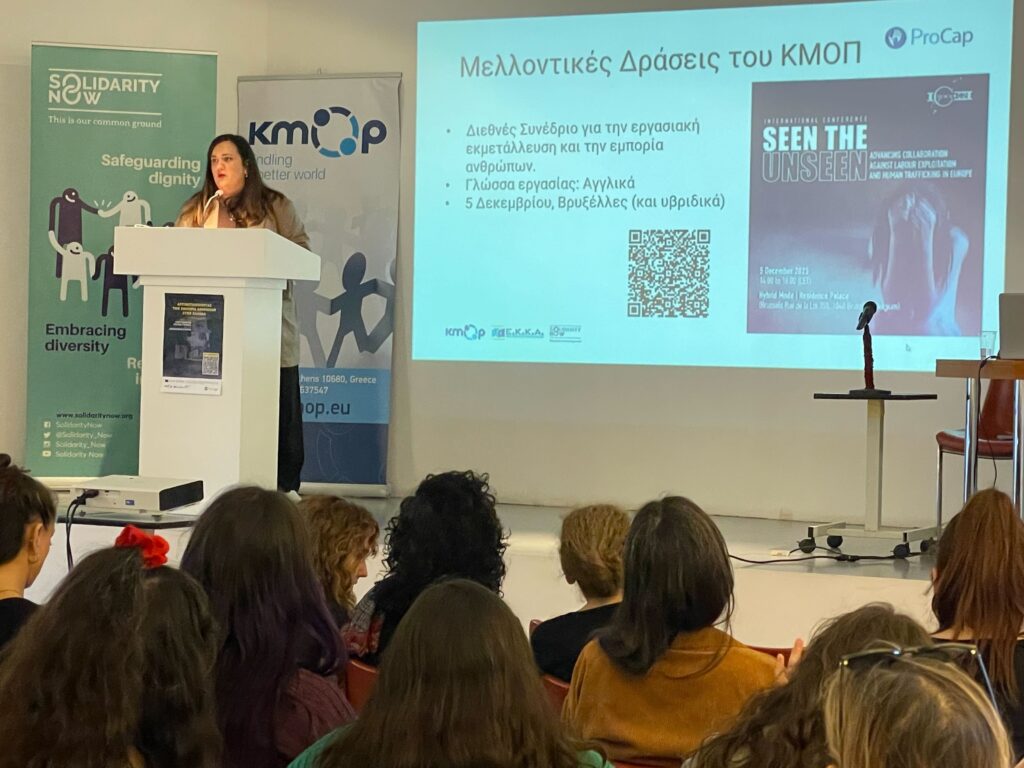 Το ΚΜΟΠ, σε συνεργασία με το ΕΚΚΑ – Εθνικό Κέντρο Κοινωνικής Αλληλεγγύης και το SolidarityNow, πραγματοποίησε την Τετάρτη 26 Νοεμβρίου 2025, στο Ιωνικό Κέντρο στην Αθήνα, την ενημερωτική εκδήλωση με τίτλο «Αντιμετωπίζοντας την εμπορία ανθρώπων στην Ελλάδα: Ο ρόλος των επαγγελματιών πρώτης γραμμής και των κοινωνικών εταίρων».
