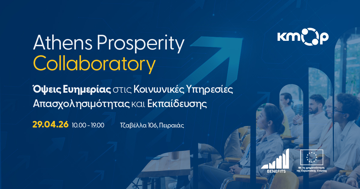 Το ΚΜΟΠ – Κέντρο Κοινωνικής Δράσης και Καινοτομίας σας προσκαλεί την Τετάρτη 29 Απριλίου 2026, από τις 10:00 έως τις 19:00, στην εκδήλωση με τίτλο: «Όψεις Ευημερίας στις Κοινωνικές Υπηρεσίες Απασχολησιμότητας και Εκπαίδευσης».