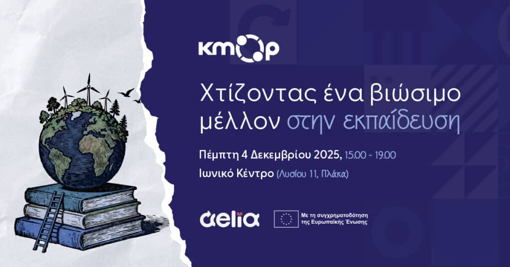 Το ΚΜΟΠ, σε συνεργασία με το Ινστιτούτο Εκπαιδευτικής Πολιτικής, σε προσκαλεί στην εκδήλωση «Χτίζοντας ένα βιώσιμο μέλλον στην εκπαίδευση» την Πέμπτη 4 Δεκεμβρίου 2025 και ώρα: 15.00–19.00, στο Ιωνικό Κέντρο (Λυσίου 11, Πλάκα).