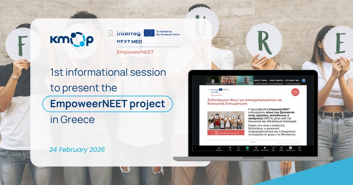 On 24 February 2026, KMOP successfully hosted online the 1st informational session to present its new initiative “EmpoweerNEET” focused on empowering youth not in employment, education or training across the Mediterranean region.
