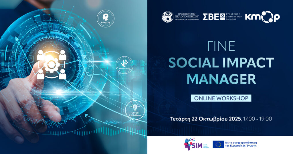 Το Πανεπιστήμιο Πελοποννήσου, ο Σύνδεσμος Βιομηχανιών Ελλάδος (ΣΒΕ) και το ΚΜΟΠ – Κέντρο Κοινωνικής Δράσης και Καινοτομίας σας προσκαλούν στο διαδικτυακό workshop «Γίνε Social Impact Manager», την Τετάρτη, 22 Οκτωβρίου 2025, από τις 17.00 έως 19:00.